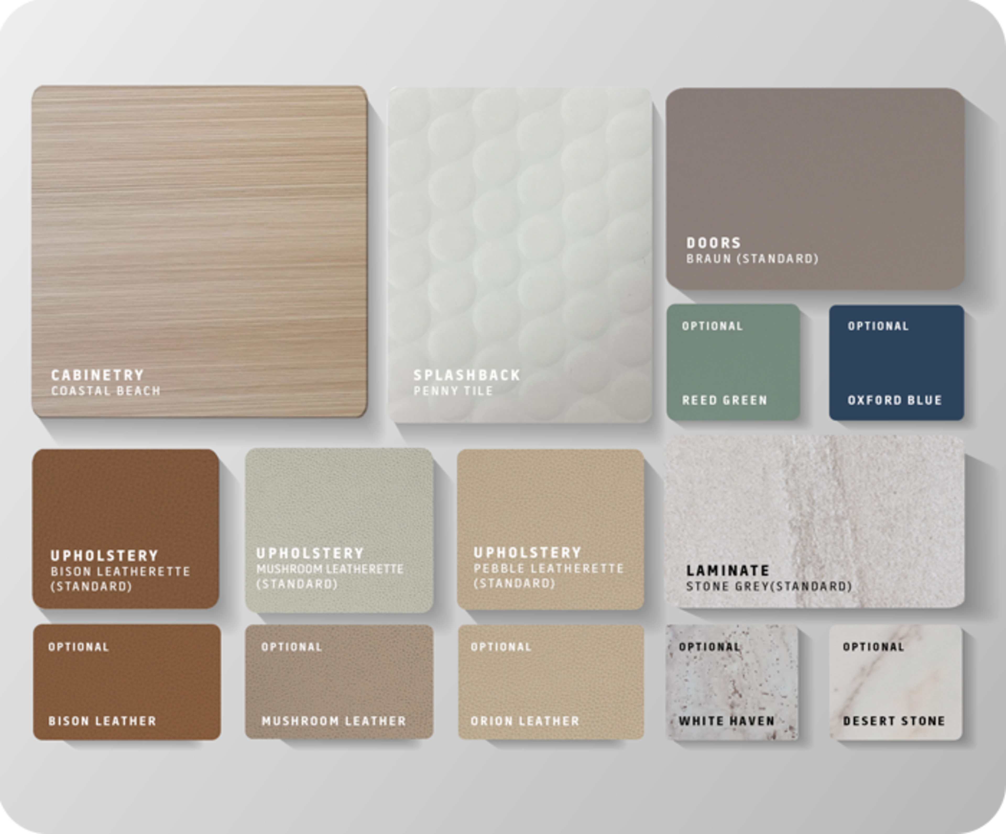 Your adventure vehicle should reflect your style. The new CrossTrak offers a carefully chosen palette of external graphics and interior materials designed to impress. Explore the range of stylish door and laminate options alongside our selection of plush yet durable seating fabrics. It’s the perfect blend of modern aesthetic and off-road resilience, allowing you to build an inviting space for every remote escape.