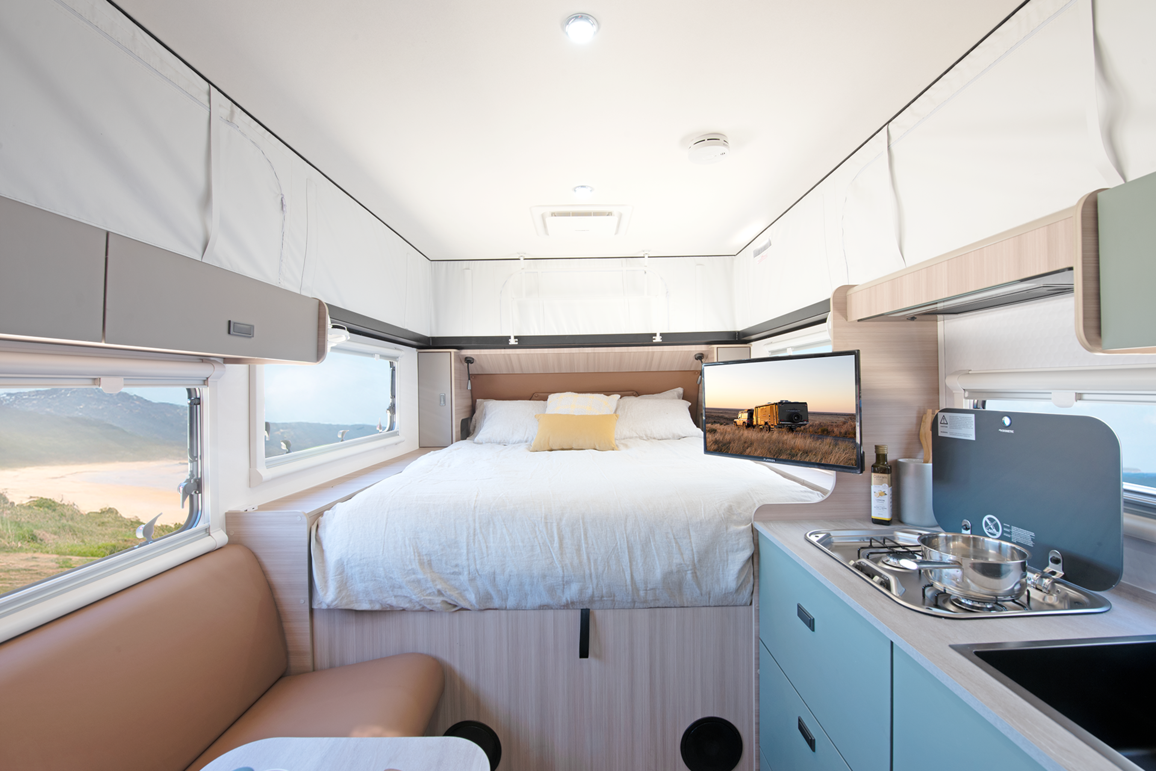 The next evolution of the Jayco hybrid is here. The 2025 CrossTrak Pop-Top blends the maneuverability of a camper with the comfort of a caravan, all in a tough, compact package. Its dune-coloured exterior and durable design with refined interior finishes—from clever storage to luxurious seating—make setup and pack-down effortless. It’s the smart way to chase the horizon.