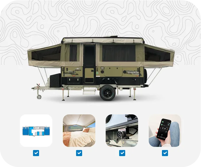 As the largest camper trailer in the Jayco range, the Jayco Swan offers plenty of space with slide-out bed ends on both sides—giving you room to move, just like a full-sized caravan. Designed to sleep up to six, it features a roomy kitchen, a generous dining area, comfortable innerspring mattresses, sturdy aluminium-framed furniture, and plenty of storage for all your gear.